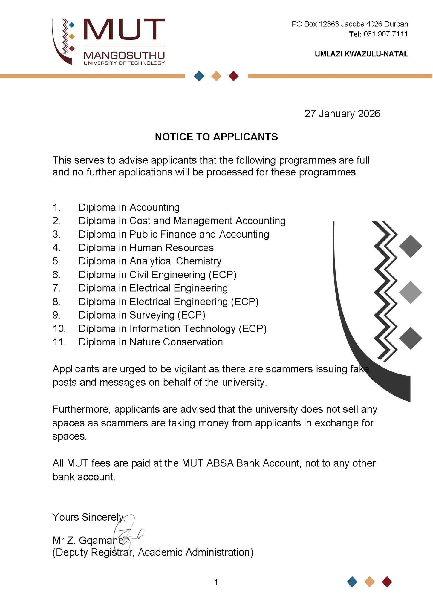 Programmes that have reached or passed the advertised closing date and are advertised with the note: “No Late Applications will be considered” will receive the “Programme Close” status. This means that for such programmes no programme applications or administration fees received after the closing date will be considered by that institution. Examples are medicine, some health sciences, and some education programmes.